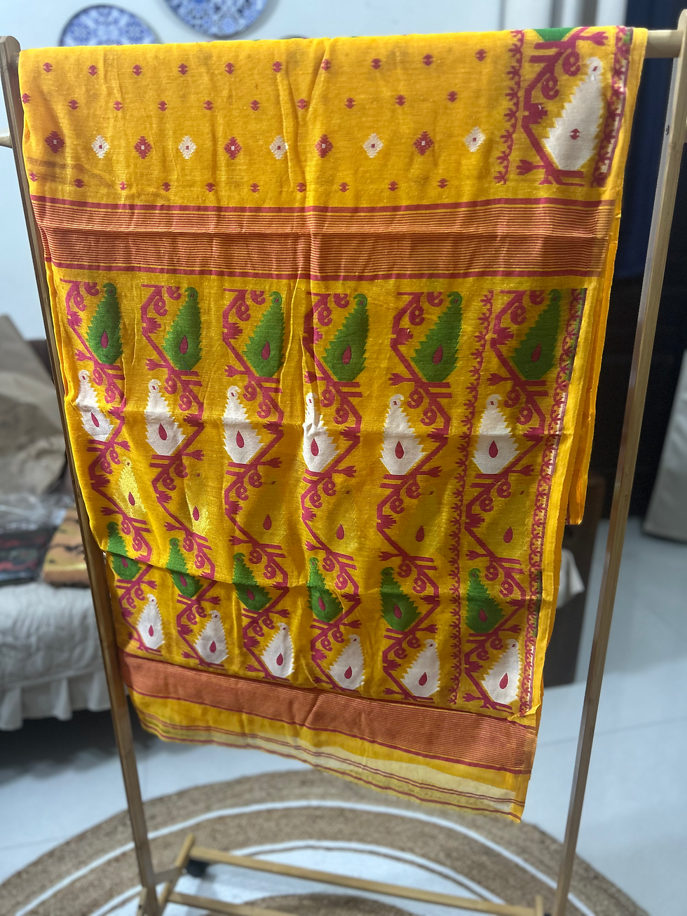 Yellow Pure Muslin Silk handwoven Jamdani Saree