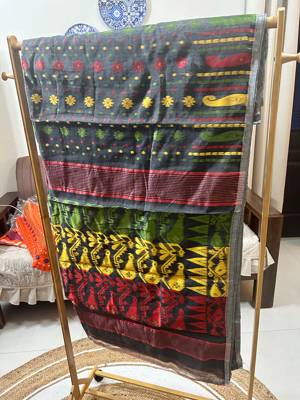 This beautiful saree, made from high-quality handspun cotton, measures 5.5 meters in length and features intricate Jamdani multicolour embroidery for a rich, traditional look. It includes a 0.80-meter blouse piece, allowing you to create a personalized blouse.